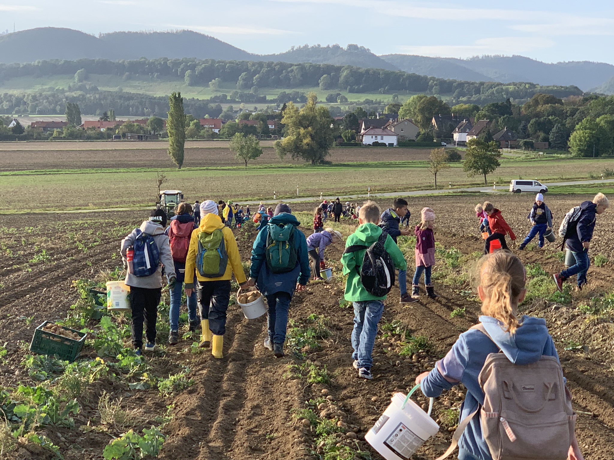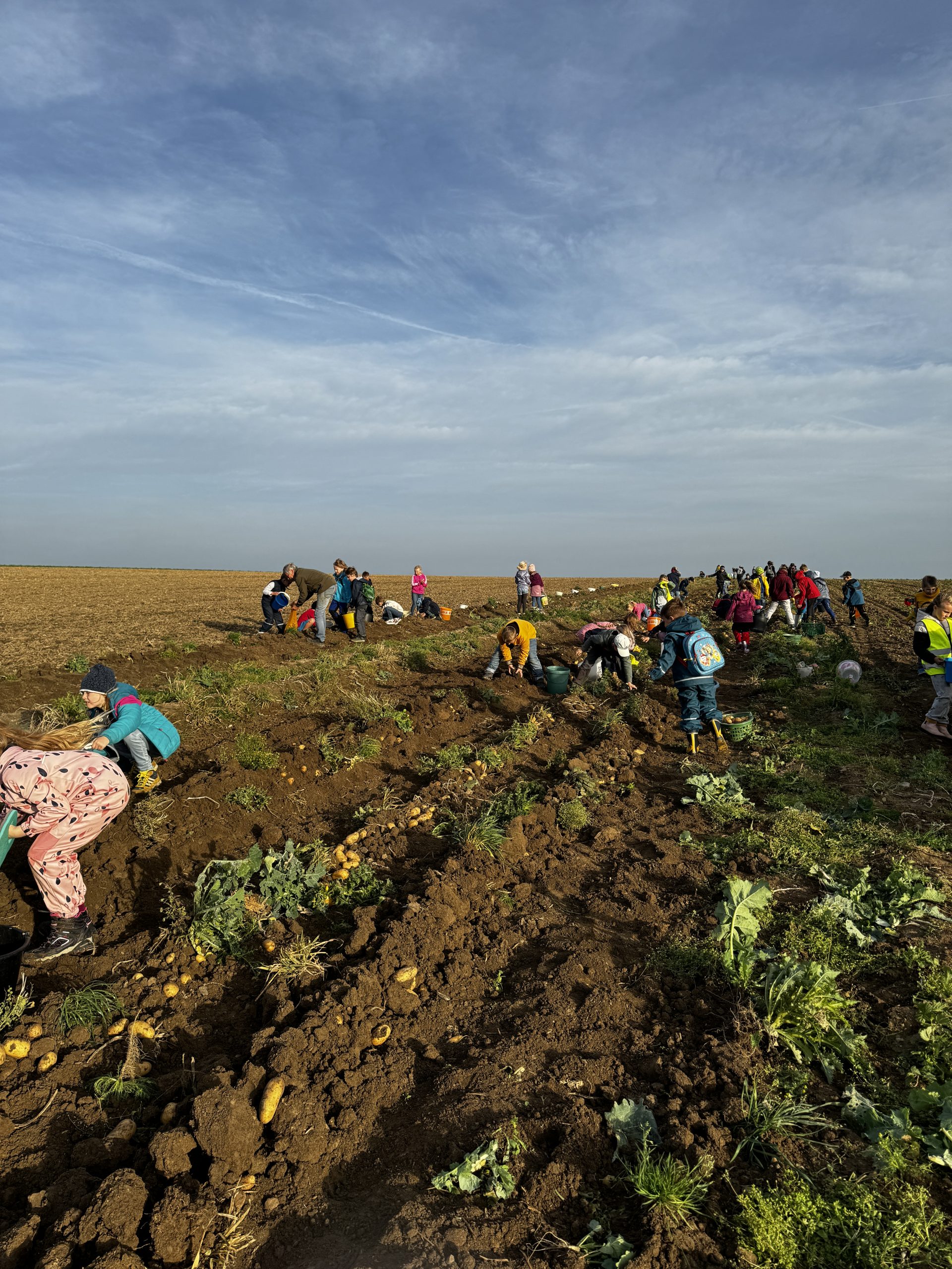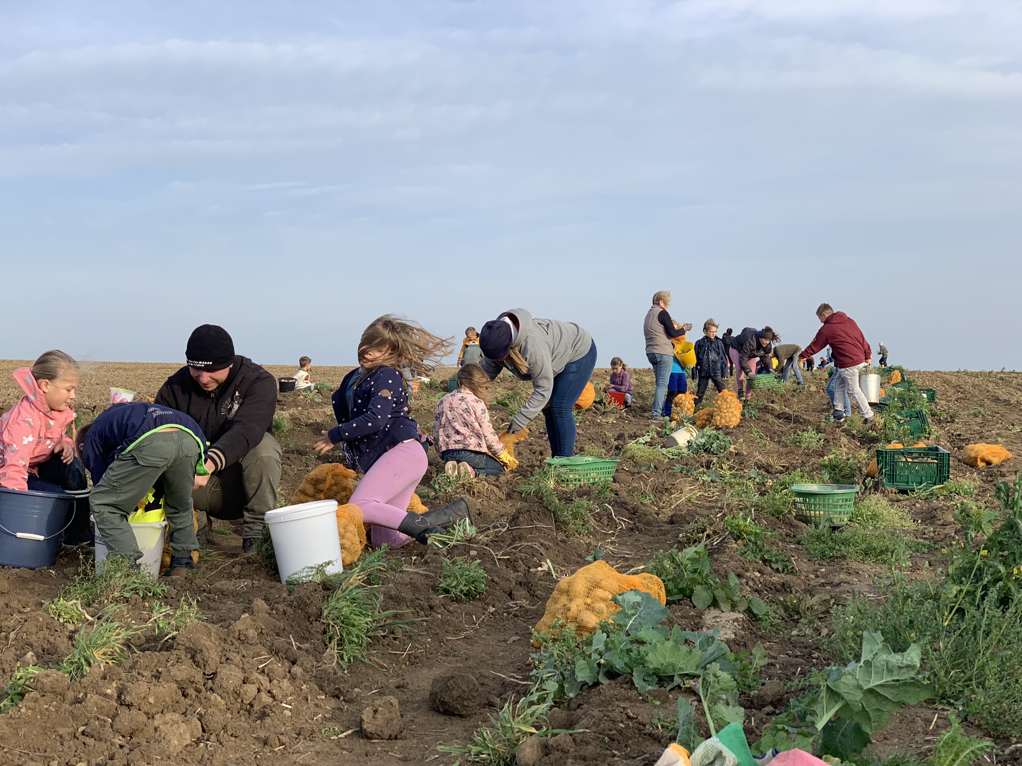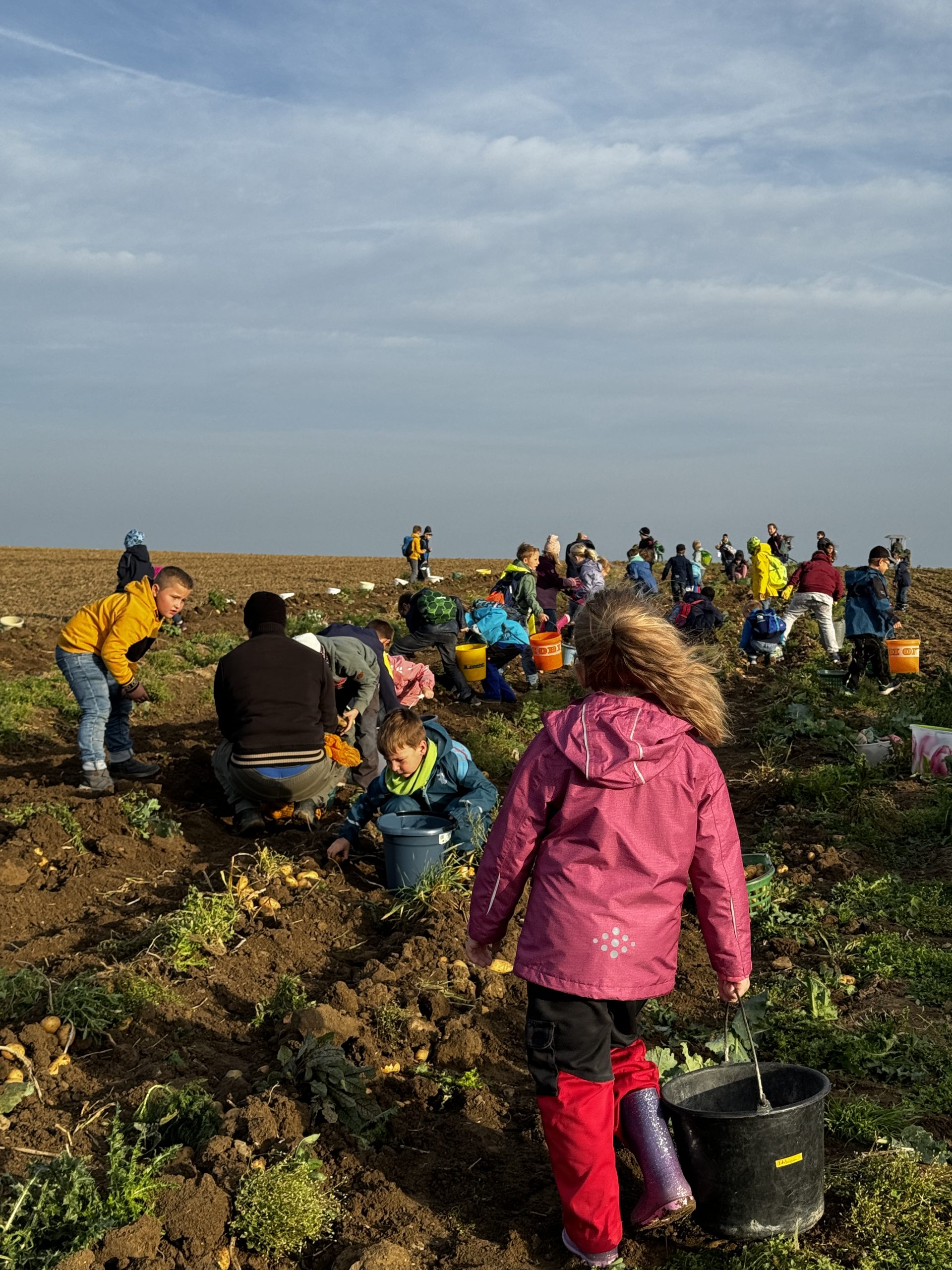 [:de]Der Weg war nicht weit bis zum Kartoffelacker in Westerode, wo wir bereits von Frau Wedde und ihrem Team erwartet wurden. Nach einer kurzen Einweisung ging es auch schon gleich an die Arbeit. Möglichst alle Kartoffeln aus der Erde zu sammeln war das Ziel. Schnell füllten sich die ersten Eimer, die direkt vor Ort in Säcke umgefüllt wurden. Nach gut 2 Stunden fleißigster Arbeit war das Feld leer und die Kinder hatten an diesem Tag viel gelernt über Ausdauer, Fleiß, den Ursprung unserer Lebensmittel, die harte Arbeit auf dem Feld, über Teamarbeit, Dankbarkeit und Großzügigkeit.